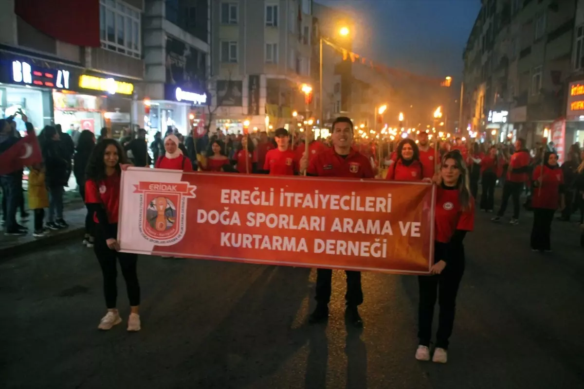 Karadeniz Ereğli ilçesinde de Bağlık Mahallesi’nde toplanan protokol üyeleri ve vatandaşlar, ellerinde Türk bayrakları ve meşalelerle Devrim Bulvarı’ndaki Atatürk Anıtı önüne bando eşliğinde yürüdü.