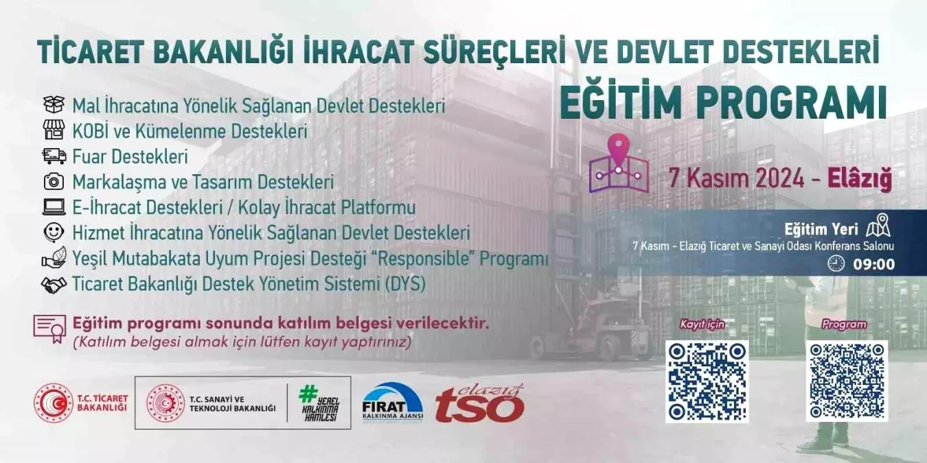 Ticaret Bakanlığı ve Elazığ Ticaret ve Sanayi Odası İşbirliği ile düzenlenecek programda, Bakanlık yetkilileri tarafından yatımcılara sağlanan destekler konusunda detaylı bilgiler verilecek. Eğitim programında şu konular hakkında bilgiler verilecek, “Mal ihracatına yönelik sağlanan devlet destekleri, KOBİ ve kümeleme destekleri, fuar destekleri, markalaşma ve tasarım destekleri, e-ihracat destekleri/ kolay ihracat platformu, hizmet ihracatına yönelik sağlanan devlet destekleri, yeşil mutabakata uyum projesi destekleri ‘responsible’ programı, Ticaret Bakanlığı destek yönetim sistemi.”