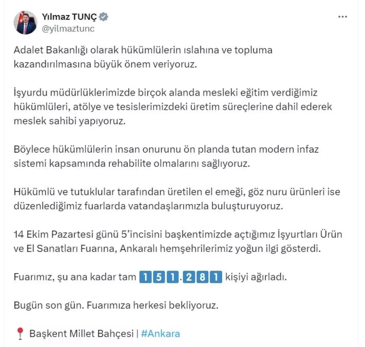 Bakan Tunç, Ankara Millet Bahçesi’nde düzenlenen İşyurtları Ürün ve El Sanatları Fuarı’na ilişkin sosyal medya hesabından açıklama yaptı. Bakan Tunç, “Adalet Bakanlığı olarak hükümlülerin ıslahına ve topluma kazandırılmasına büyük önem veriyoruz. İşyurdu müdürlüklerimizde birçok alanda mesleki eğitim verdiğimiz hükümlüleri, atölye ve tesislerimizdeki üretim süreçlerine dahil ederek meslek sahibi yapıyoruz. Böylece hükümlülerin insan onurunu ön planda tutan modern infaz sistemi kapsamında rehabilite olmalarını sağlıyoruz. Hükümlü ve tutuklular tarafından üretilen el emeği, göz nuru ürünleri ise düzenlediğimiz fuarlarda vatandaşlarımızla buluşturuyoruz. 14 Ekim Pazartesi günü 5’incisini başkentimizde açtığımız İşyurtları Ürün ve El Sanatları Fuarına, Ankaralı hemşehrilerimiz yoğun ilgi gösterdi. Fuarımız, şu ana kadar tam 151 bin 281 kişiyi ağırladı. Bugün son gün. Fuarımıza herkesi bekliyoruz” dedi.