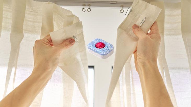 Bulaşık tabletlerindeki maddeler aynı zamanda perdeleri de temizleyebilir. Lekeleri gidermek, parlatmak ve zorlu kirleri çıkarmak için bulaşık tabletlerini tercihe edebilirsiniz. Temizlemek istediğiniz perdeler lekeliyse, bu yöntem daha verimli sonuçlar sağlayabilir. Kullandığınız özel bir deterjan varsa, deterjan bölmesine ilk önce onu ekleyin. Ardından, bulaşık tabletini tüllerin üzerine bırakıp perdeler için önerilen yıkama programında yıkayın.
