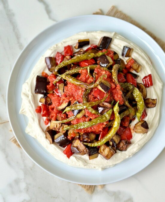 - Servis tabağında yoğurtlu karışımı ortası çukur kalacak formda yayın. Üzerine kızarmış zerzevatları yerleştirin ve son olarak domates sosunu sebzelerin üzerine gezdirin.
